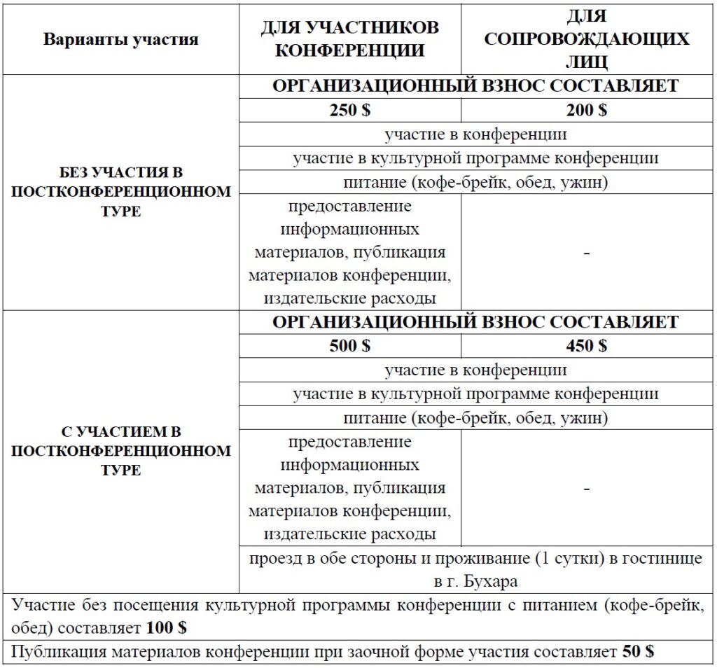 Оплата взноса за участие в конференции должна осуществляться наличными в долларах США или в национальной валюте (в сумах) по курсу Центрального Банка Республики Узбекистан на день оплаты.